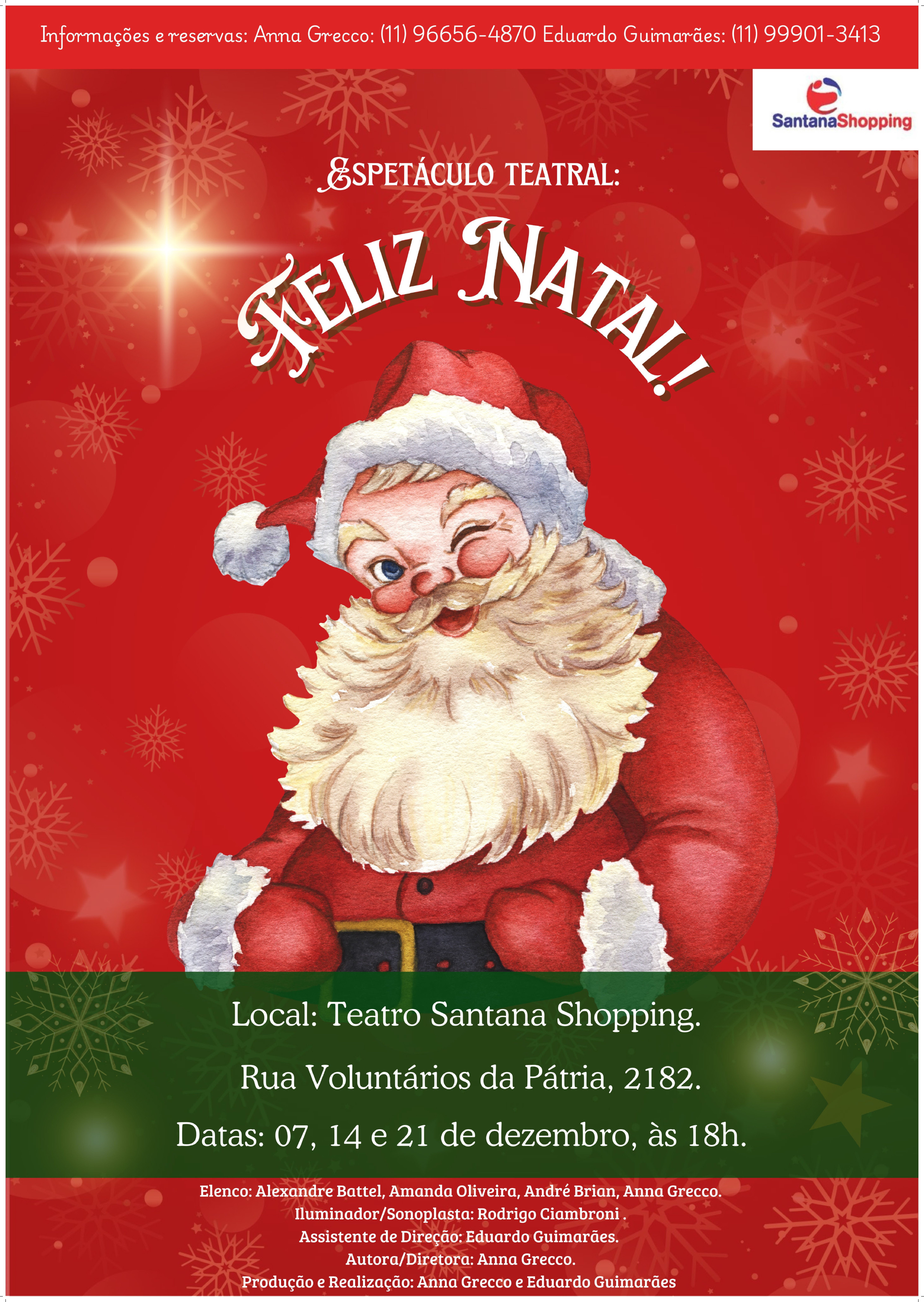 O Teatro Santana Shopping será palco do espetáculo "Feliz Natal", uma peça que promete encantar o público com uma história de magia, esperança e reflexões sobre o verdadeiro significado do Natal. Com apresentações nos dias 7, 14 e 21 de dezembro, sempre às 18h, o espetáculo é destinado a toda a família, unindo emoção e diversão para celebrar a data mais especial do ano.