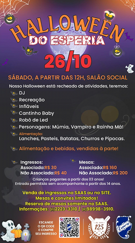 No dia 26 de outubro, a partir das 12h, o Clube Esperia realizará sua tradicional Festa de Halloween, um evento especialmente pensado para o público infantil e suas famílias. Com uma programação diversificada que inclui brincadeiras temáticas, dança, brinquedos e atividades recreativas, o evento promete proporcionar um dia de diversão e encantamento para crianças de todas as idades.